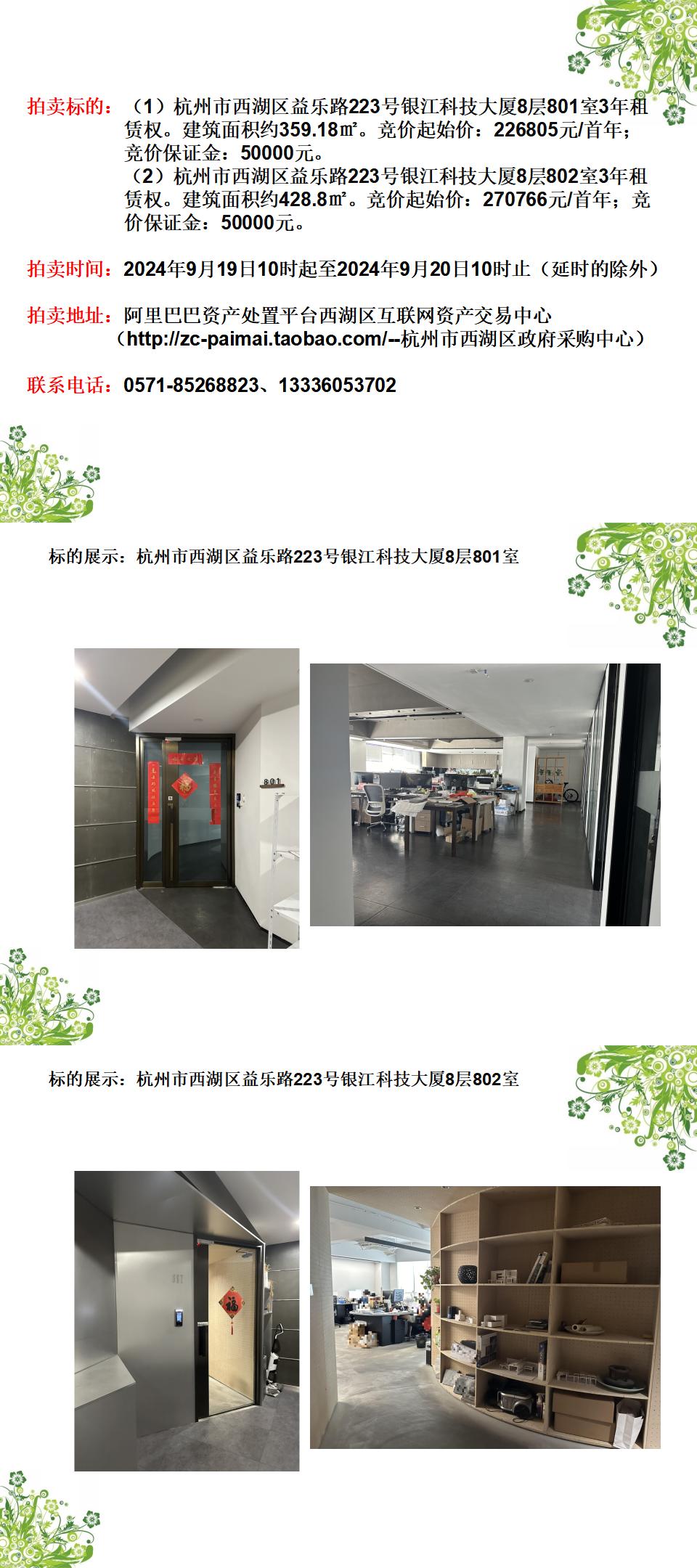 杭州市西湖區(qū)益樂路223號銀江科技大廈8層801及802室3年租賃權