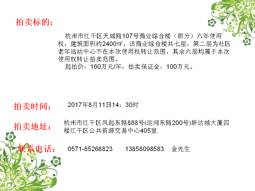 江干區(qū)天城路107號商業(yè)綜合樓(部分)使用權轉讓拍賣