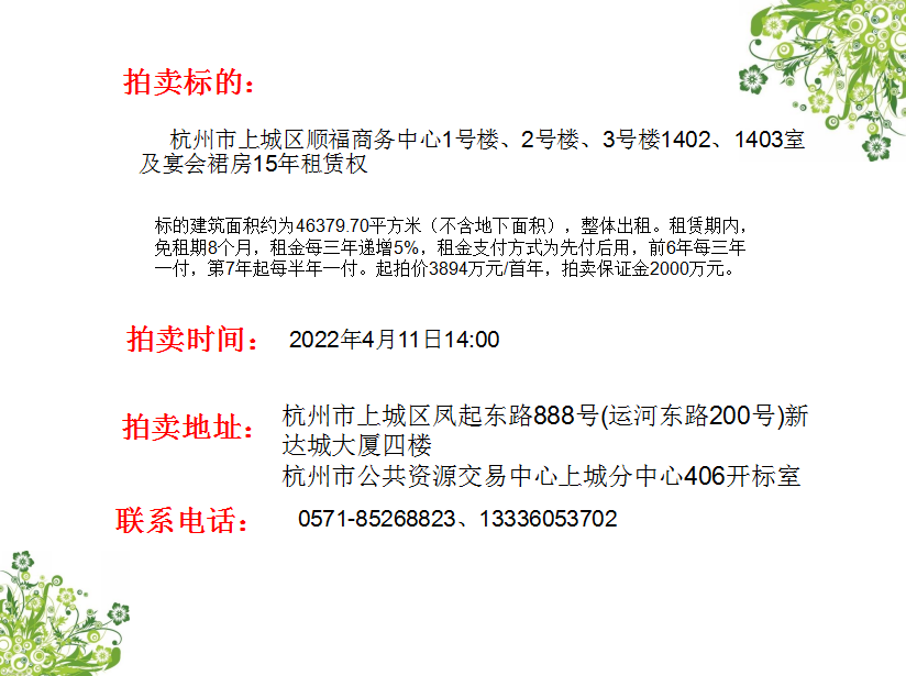 上城區(qū)順福商務(wù)中心1號樓、2號樓、3號樓1402、1403室及宴會裙房15年租賃權(quán)。