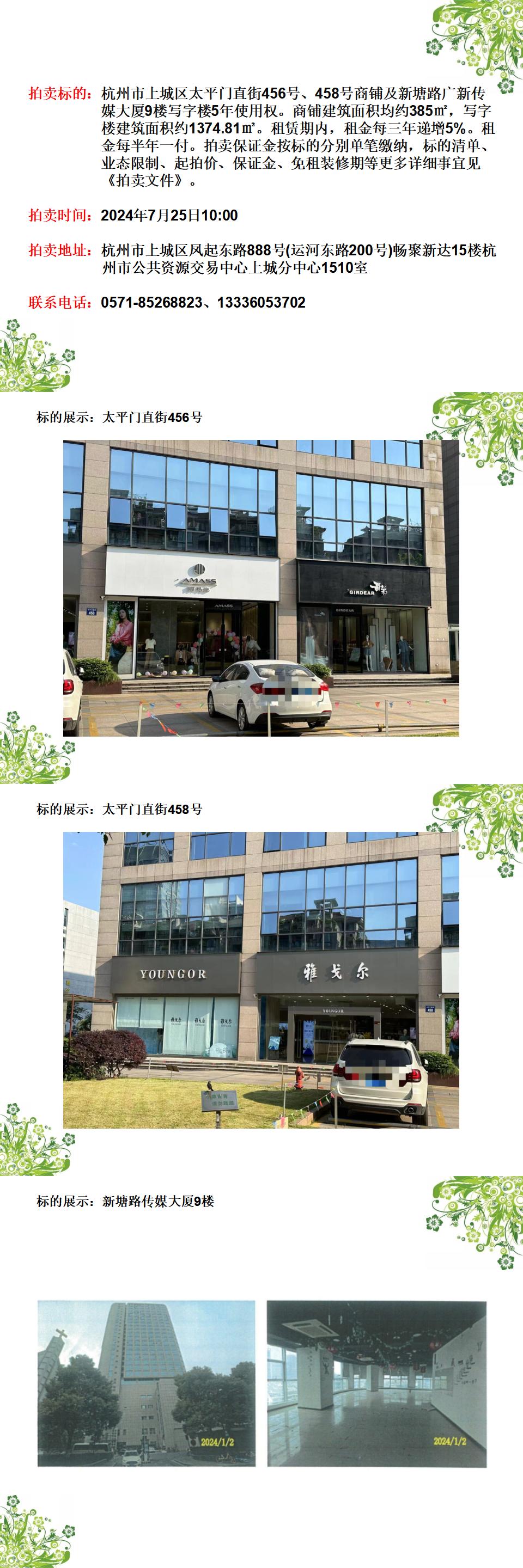 杭州市上城區(qū)太平門直街456號(hào)、458號(hào)商鋪及新塘路廣新傳媒大廈9樓寫字樓5年使用權(quán)