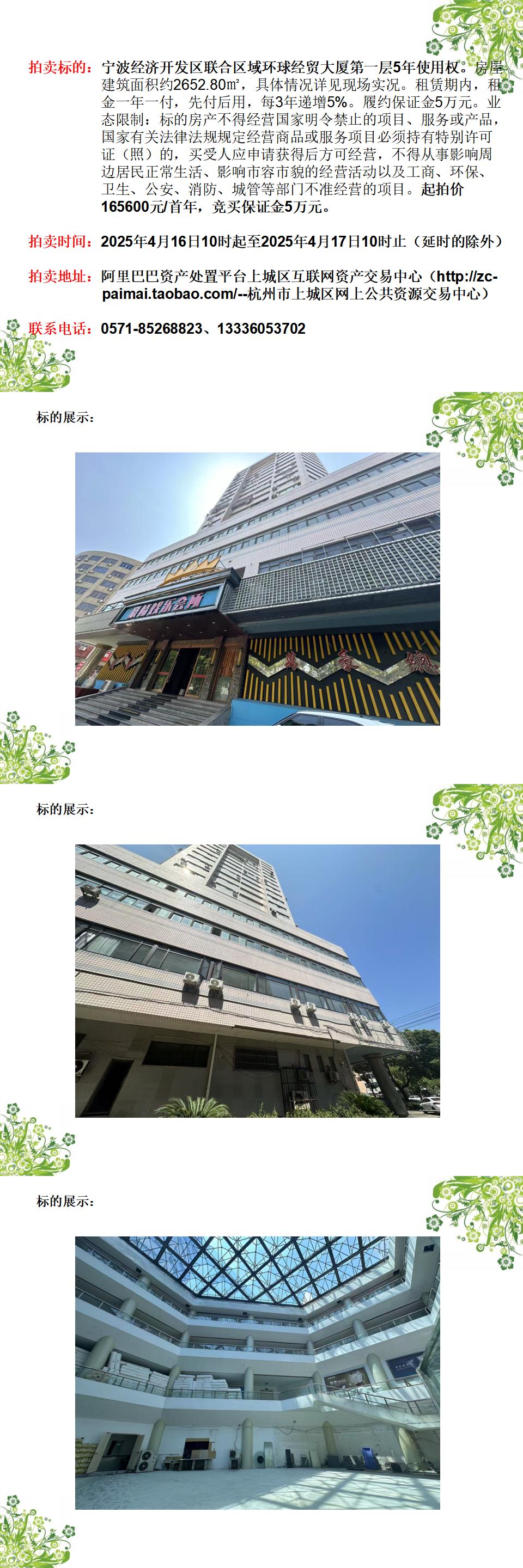 寧波經(jīng)濟(jì)開發(fā)區(qū)聯(lián)合區(qū)域環(huán)球經(jīng)貿(mào)大廈第一層5年使用權(quán)